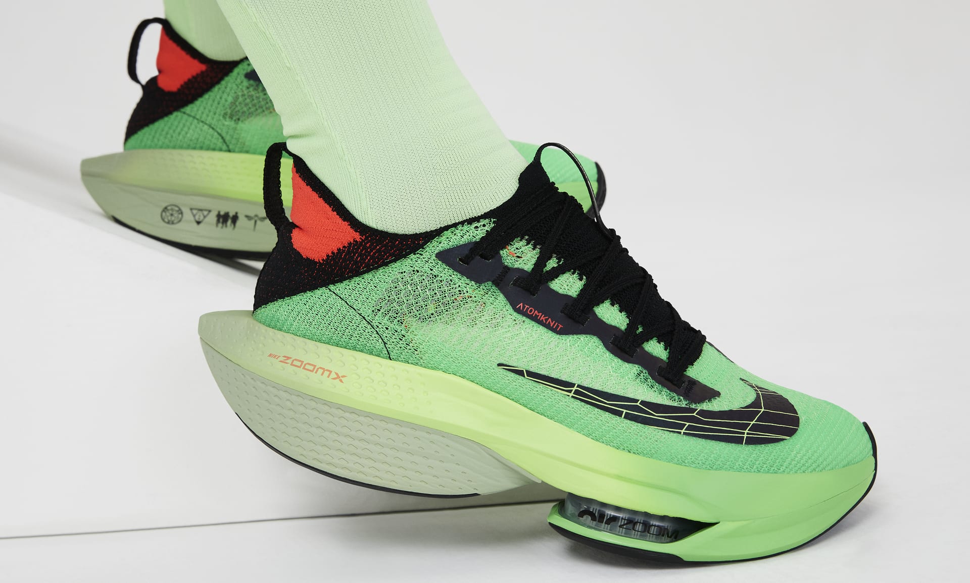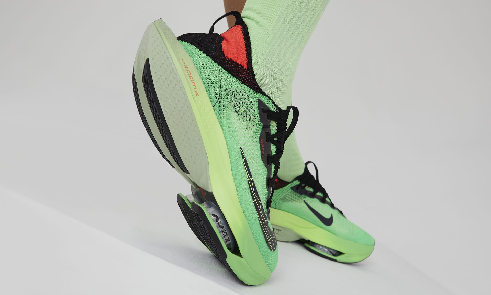 Flyknitシリーズの1つであるAtomknit素材を使用したアッパーが、足の形に合わせてフィット。軽量で抜群の通気性を発揮します。